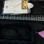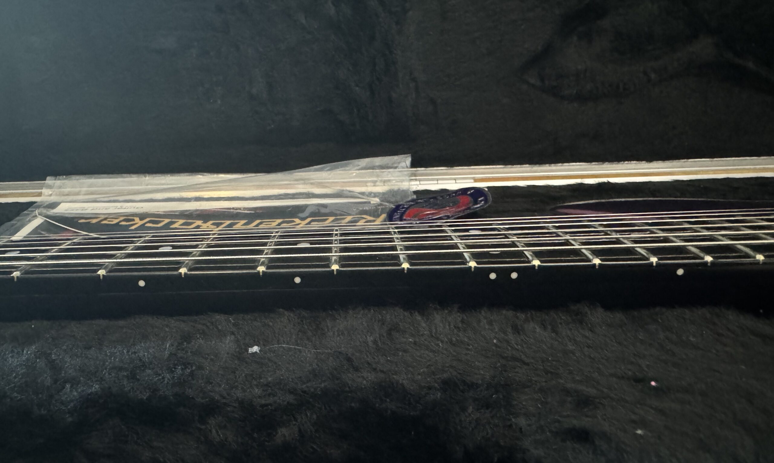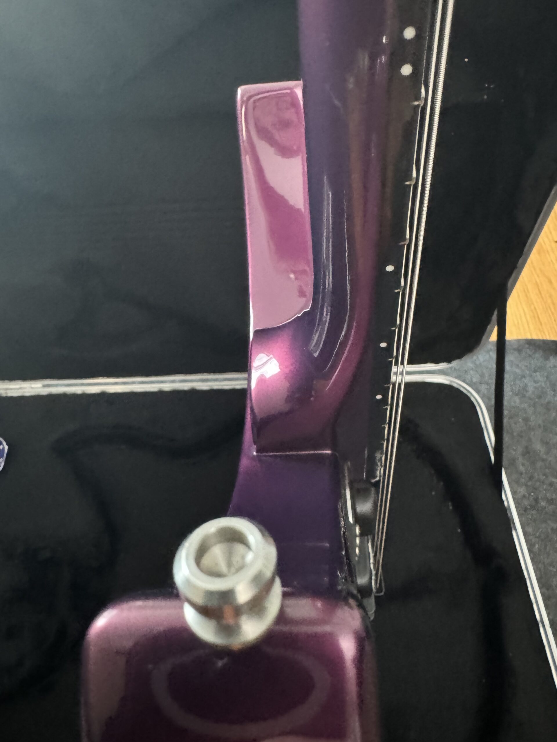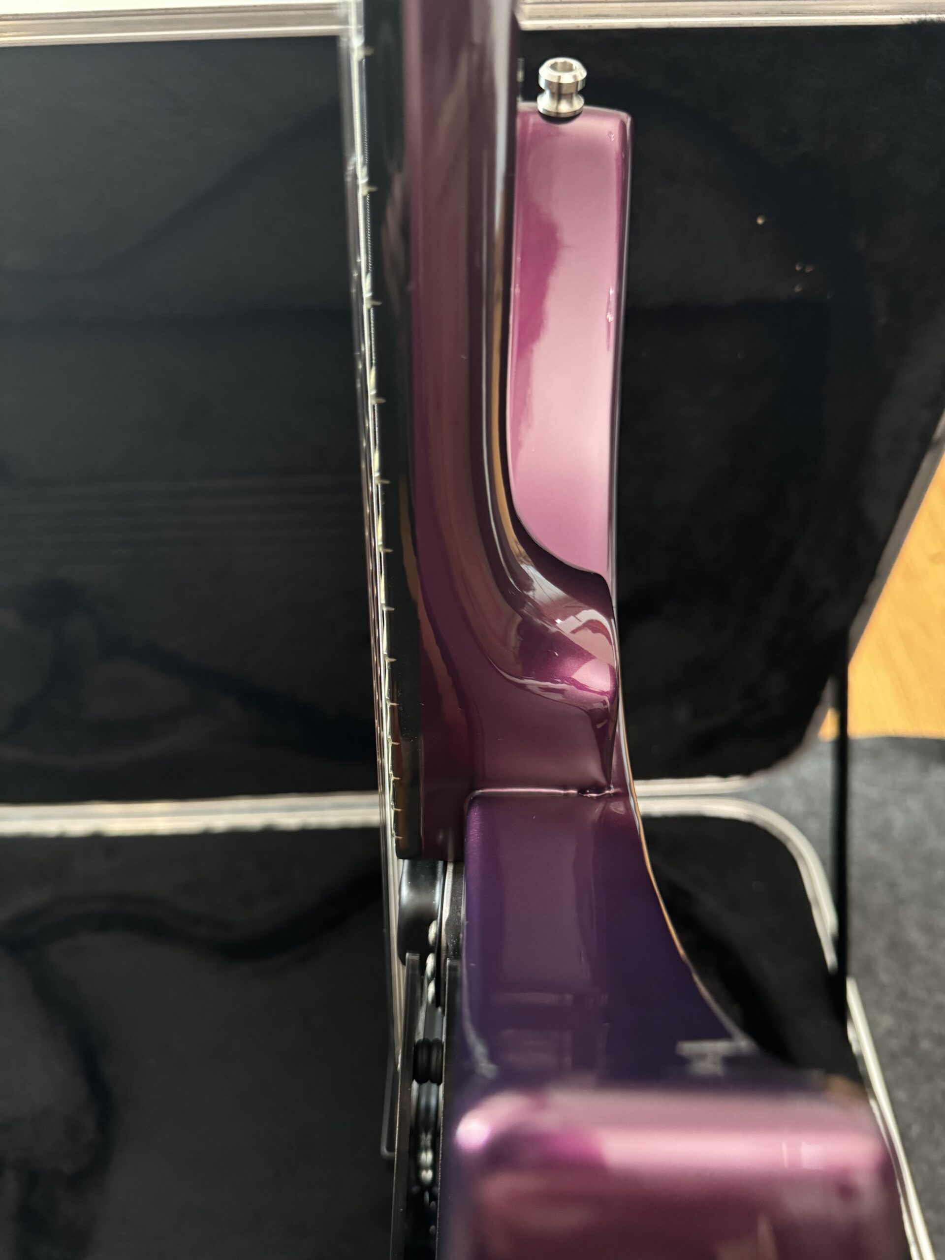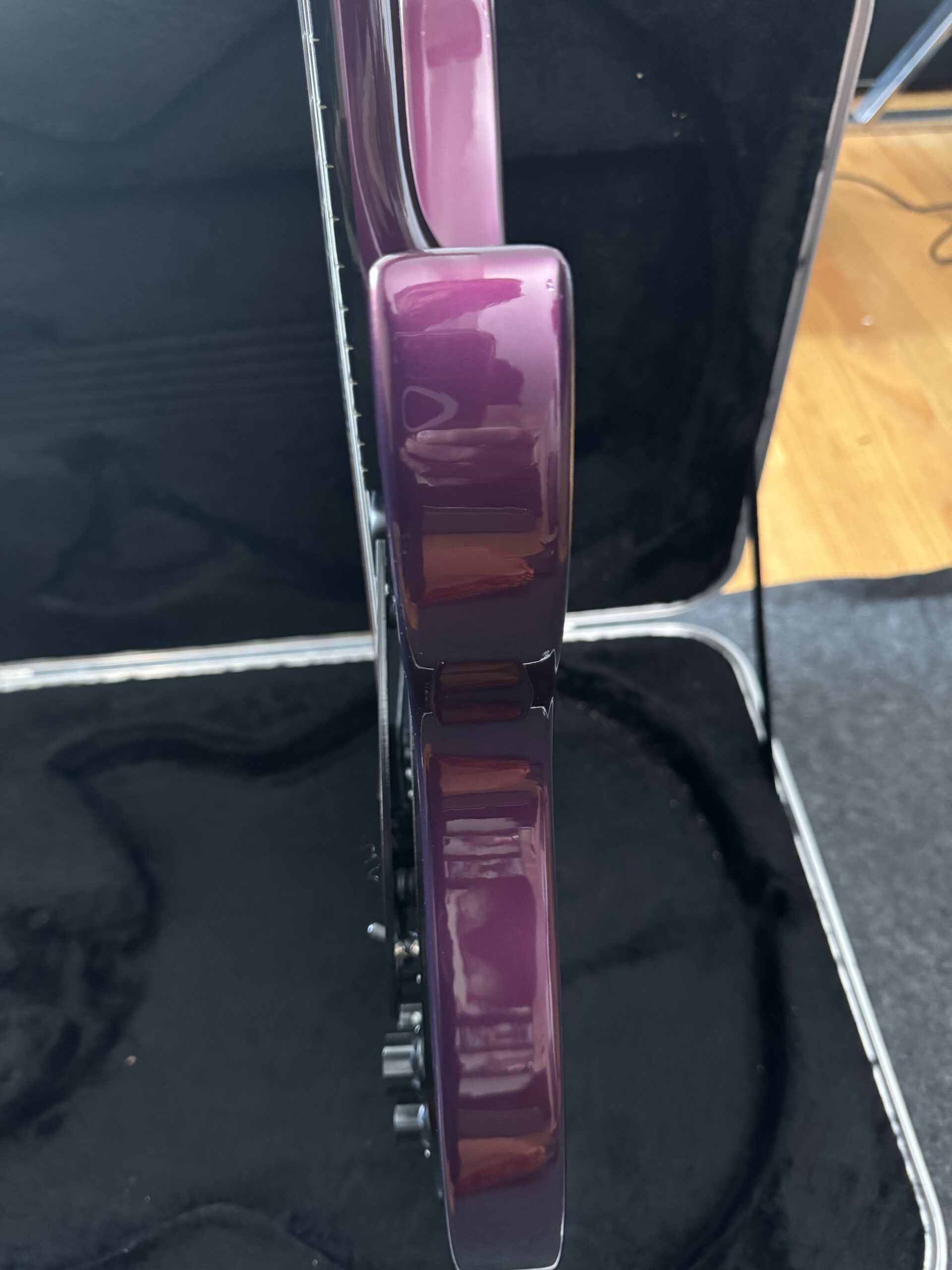 Striking color and even more impressive in person. This thing is a beauty.. I bought this new and its def spent most of its life in the case but it has been played occasionally. Never gigged, never left my home though. A few things to note.. because the fret board is black the lacquer show slight scuffing marks from normal play, bending and whatnot.. See picture. Also there is a slight lacquer bubble along the binding at the first fret. Came from the factory that way and it’s pretty minor, can’t be felt at all. Neither things are major but worth mentioning on a piece like this. Other than that no dings, dents, scratches or chips. Still has the made in USA sticker on pick guard and doesn’t even have pick marks because I don’t use a pick. Comes with OHSC and case candy as pictured.